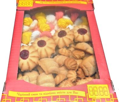 Ингредиенты: Пшеничная мука, рафинированное пальмовое масло, яблочное пюре (яблочное пюре, белый сахар), вишневая начинка (белый сахар, яблочное пюре, вишневое пюре, желирующий агент пектин, регулирующий кислотность лимонная кислота, вишневый ароматизатор, консервант сорбат калия, краситель Ponzo), кусочки глазури (белый сахар, рафинированное пальмовое масло, какао-порошок, эмульгатор E322), куриные яйца, сахар, соль, пищевая сода, ванильный ароматизатор.