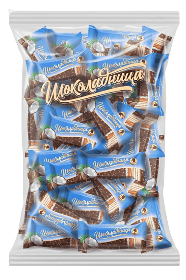 Bomboane de napolitană "Șokoladnitsa" cu cocos – o combinație de napolitană crocantă, caramel cremos cu aromă de unt, cocos și ciocolată cu lapte adevărată.