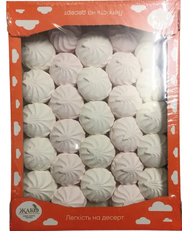 zahăr; melasă; piure de mere; albuş de ouă; zahăr pudră; agent de gelificare – pectin E440; regulatori de aciditate: acid lactic E270, citrat de sodiu E331; aromatizatori identici naturali: "Zmeură", "Vanilie"; colorant natural alimentar "Extract de carmin E120".